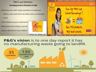 Procter & Gamble (P&G), an American consumer goods corporation founded in 1837, specializes in a range of cleaning and personal care products and recorded $83.1 billion in sales in 2014. The company has a significant presence in India, serving 650 million consumers and operating three subsidiaries with a focus on product innovation and strategic marketing to overcome macroeconomic barriers. P&G faces competition in the FMCG market, particularly from Hindustan Unilever, while positioning itself to target various consumer segments for growth.