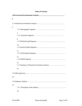 Procter & Gamble operates in over 80 countries worldwide selling over 300 brands. The document analyzes P&G's external environment through a PESTEL analysis covering political, economic, social, technological, environmental and legal factors. It then discusses key driving forces for P&G including a focus on product innovation through consumer research and connecting with consumers, as well as regulatory influences from consumer protection groups concerned with chemicals in cosmetic products.