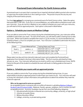 The document outlines the procedures for arranging proctored exams for an Earth Science online course, providing two options for students: scheduling exams at Madison College or finding an approved proctor. It details the requirements for proctors, responsibilities, and how students can submit their proctored exam applications, including important deadlines and testing windows. Additionally, the document contains instructions for managing the exam process to ensure the integrity and security of the examination.