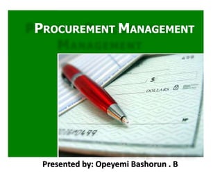 The document discusses procurement management. It describes the key inputs, tools and techniques, and outputs of the plan procurement management process. This includes determining requirements, developing statements of work, evaluating bids/proposals, and making make-or-buy decisions on what work will be sourced externally. The goal is to acquire the necessary goods and services for a project in an efficient and cost-effective manner that meets requirements.