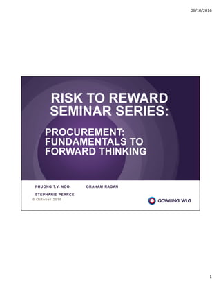 The document outlines procurement fundamentals, focusing on the perspectives of both bidders and owners, including conflict of interest definitions and management. It emphasizes the importance of fairness, transparency, and compliance with procurement processes, including the inquiry process for clarification of requirements. It also discusses the implications of sole sourcing contracts and the criteria for selecting winning bidders.