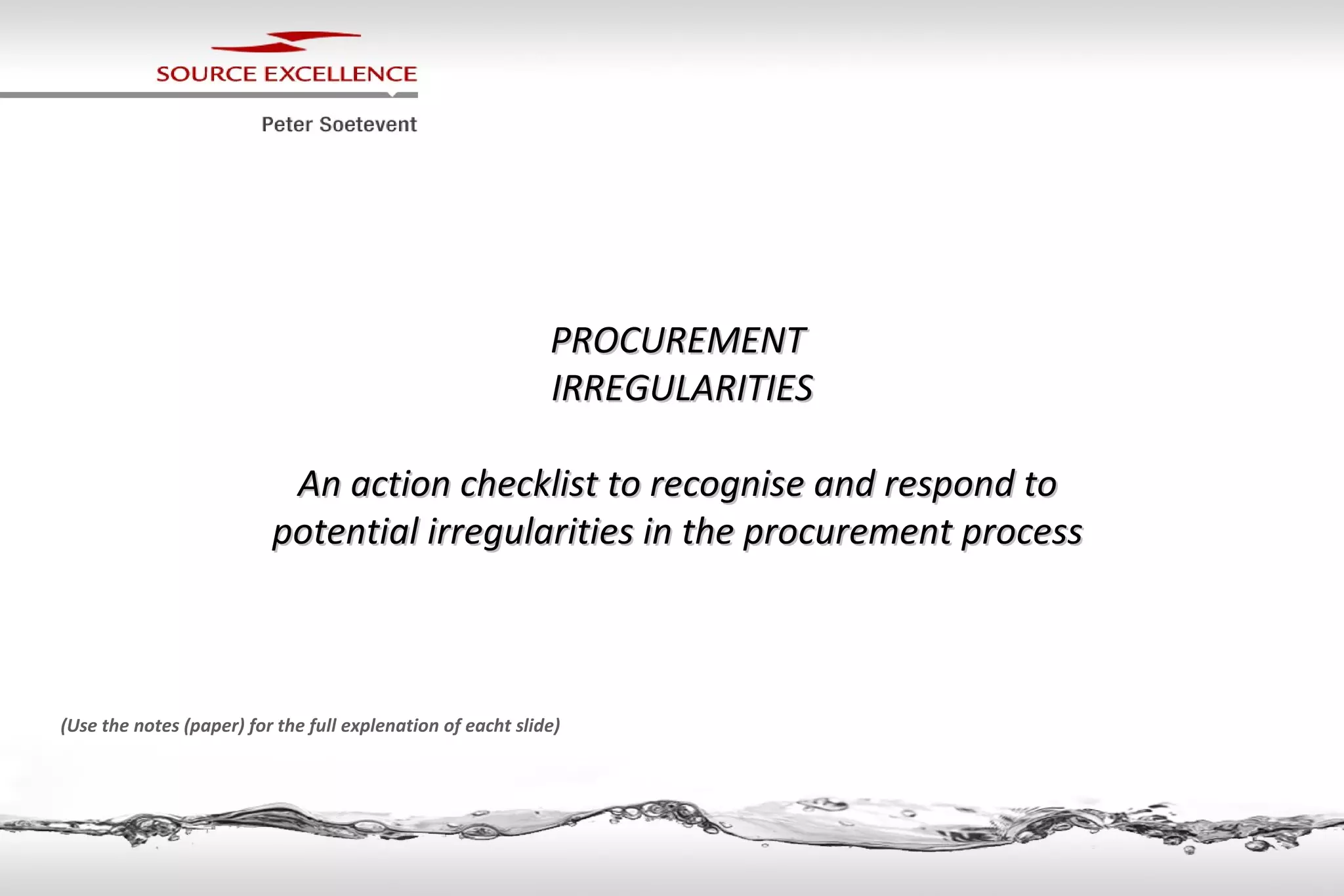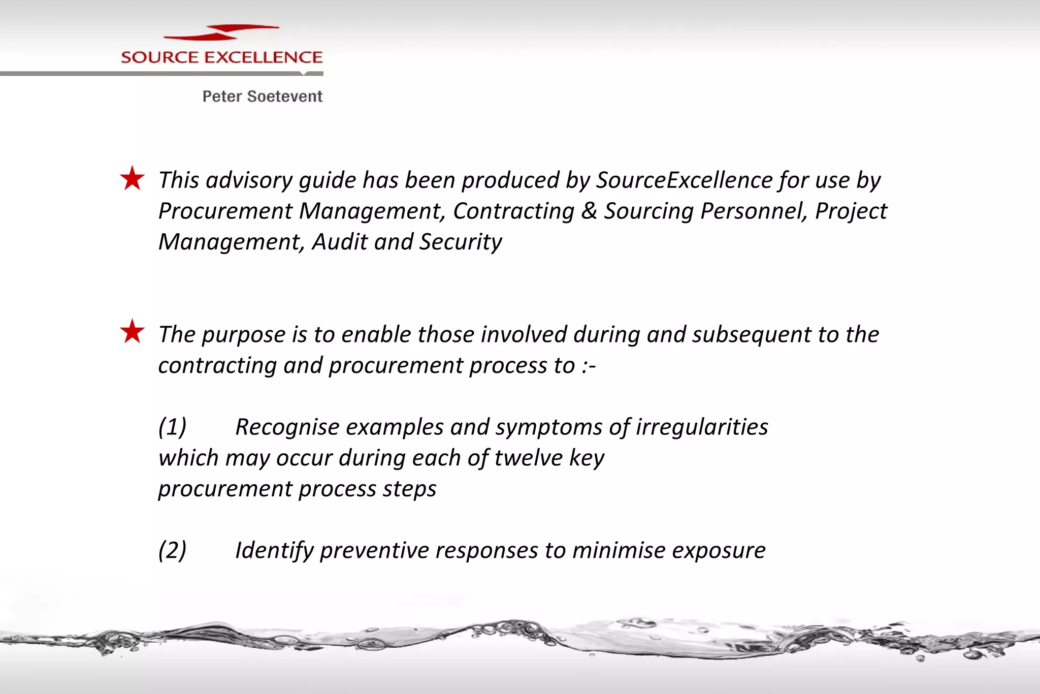 This document outlines a checklist for recognizing and responding to potential irregularities in the procurement process. It identifies 12 key procurement process steps and provides examples, symptoms, and responses for irregularities that may occur at each step. The purpose is to help procurement professionals identify issues and prevent exposure to problems. The full advisory guide contains over 40 slides to help users apply the checklist to their specific needs and consult experts for further support and customized advice.