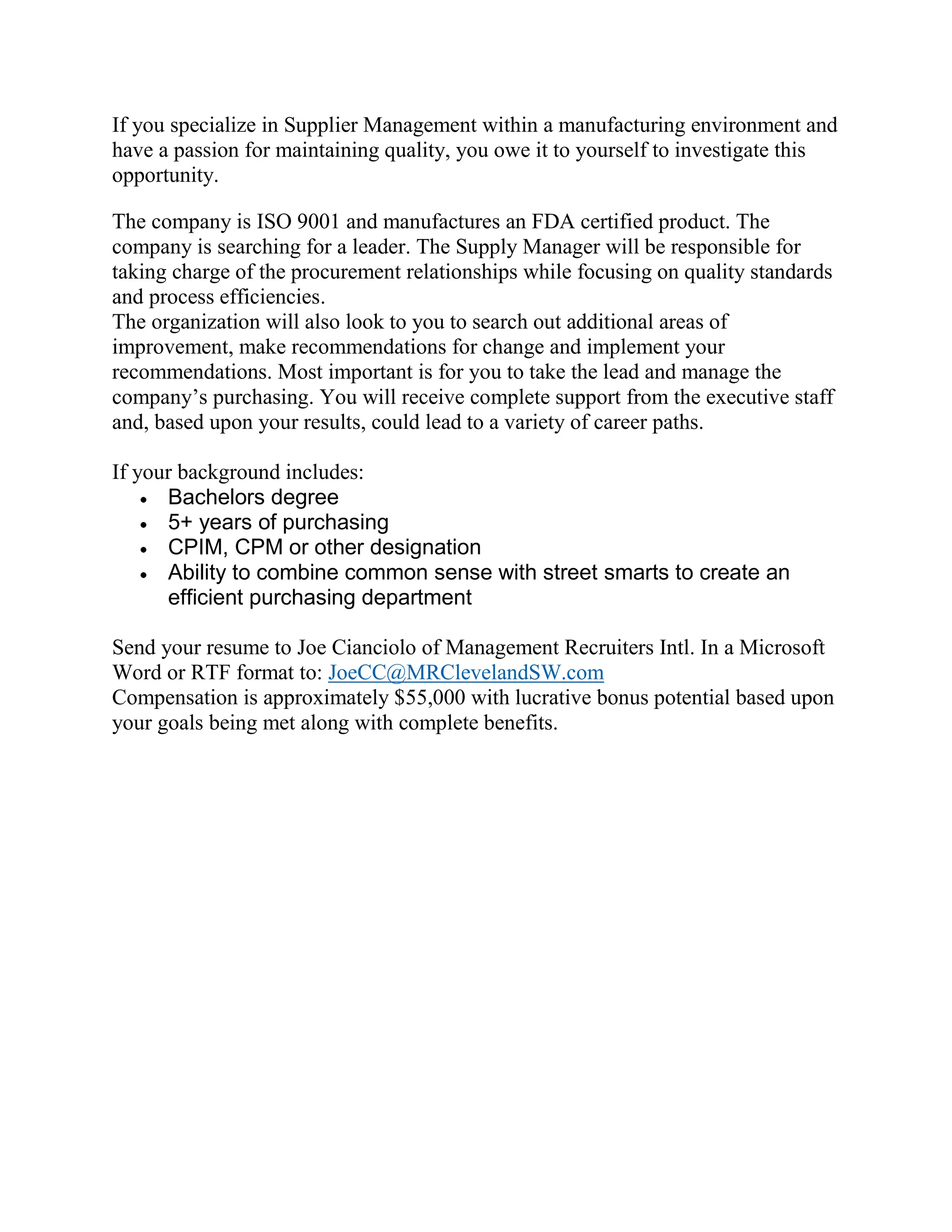 This document summarizes an opportunity for a Supply Manager position at a manufacturing company that is ISO 9001 certified and produces an FDA approved product. The Supply Manager will be responsible for managing procurement relationships with a focus on quality standards and process efficiencies, identifying additional improvement areas, and managing the company's purchasing. The role offers full support from executive staff and potential for career advancement based on results. The ideal candidate has a Bachelor's degree, 5+ years of purchasing experience, CPIM/CPM certification, and can efficiently manage the purchasing department.