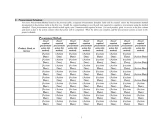 The document outlines a procurement plan for a project including: general information about the project; a summary of all products, goods, and services to be procured, identifying responsible personnel and selected procurement methods; and procurement schedules detailing the required actions and dates for each procurement method. The plan provides a framework for documenting and managing all procurement activities in a coordinated manner over the course of the project.