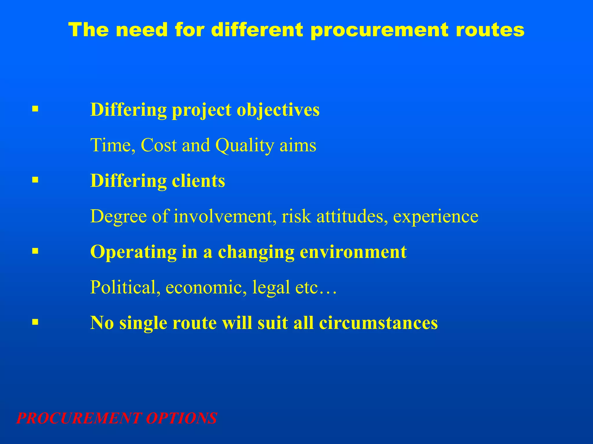 This document discusses procurement systems for construction projects. It outlines several key procurement options including traditional/conventional methods where the designer completes the design and then a contractor is hired to build based on the completed design. Other options discussed include design-build where the contractor is responsible for both design and construction, management contracting where the contractor manages the design and construction process, and construction management where the client directly hires subcontractors but the contractor advises on design and management. The document compares advantages and disadvantages of each approach and notes there is no single best option, as the appropriate route depends on factors like project objectives, the client's role, and environmental conditions.