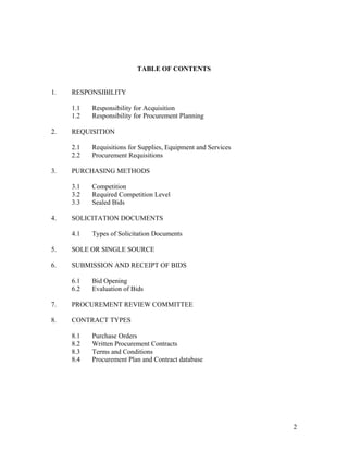 This document outlines standard operating procedures for procurement at an unnamed organization. It discusses responsibilities and procedures for requisitioning supplies and services, purchasing methods like competitive bidding, types of solicitation documents, contract types, and the roles of various committees and officials in the procurement process.