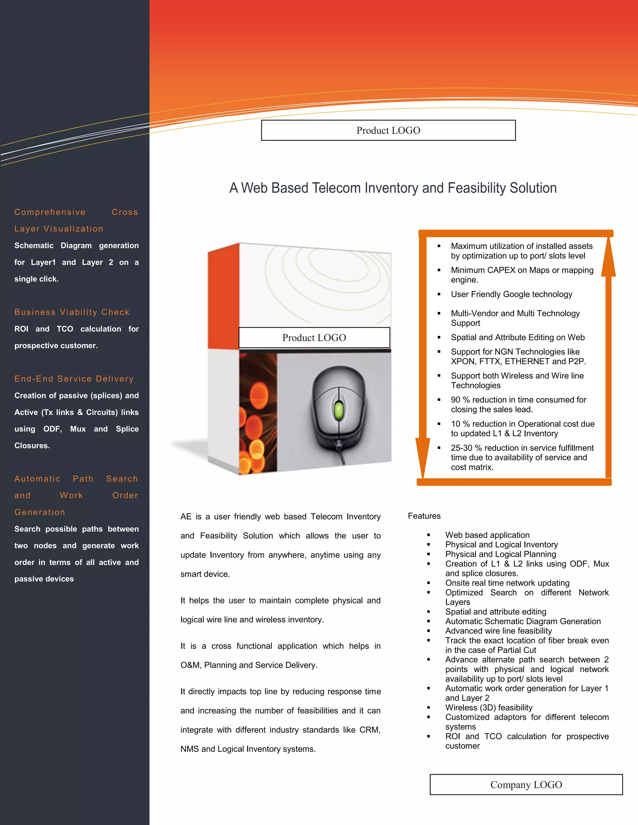 This document describes a web-based telecom inventory and feasibility solution called AE. AE allows users to update inventory from any device, maintain complete physical and logical wireline and wireless networks. It helps with operations and maintenance, planning, and service delivery. AE directly impacts revenue by reducing response times and increasing feasibility studies. It integrates with CRM, NMS, and logical inventory systems.