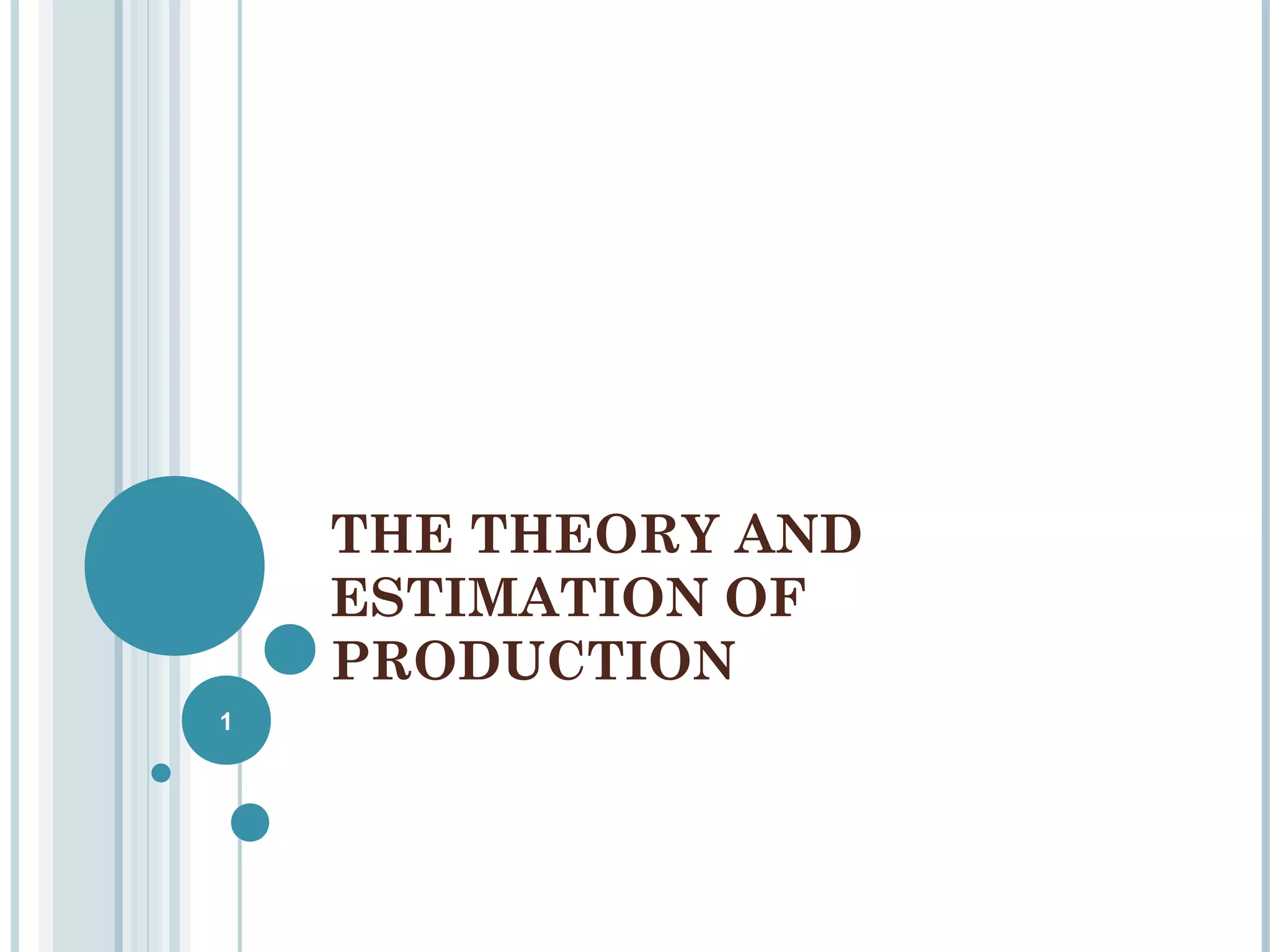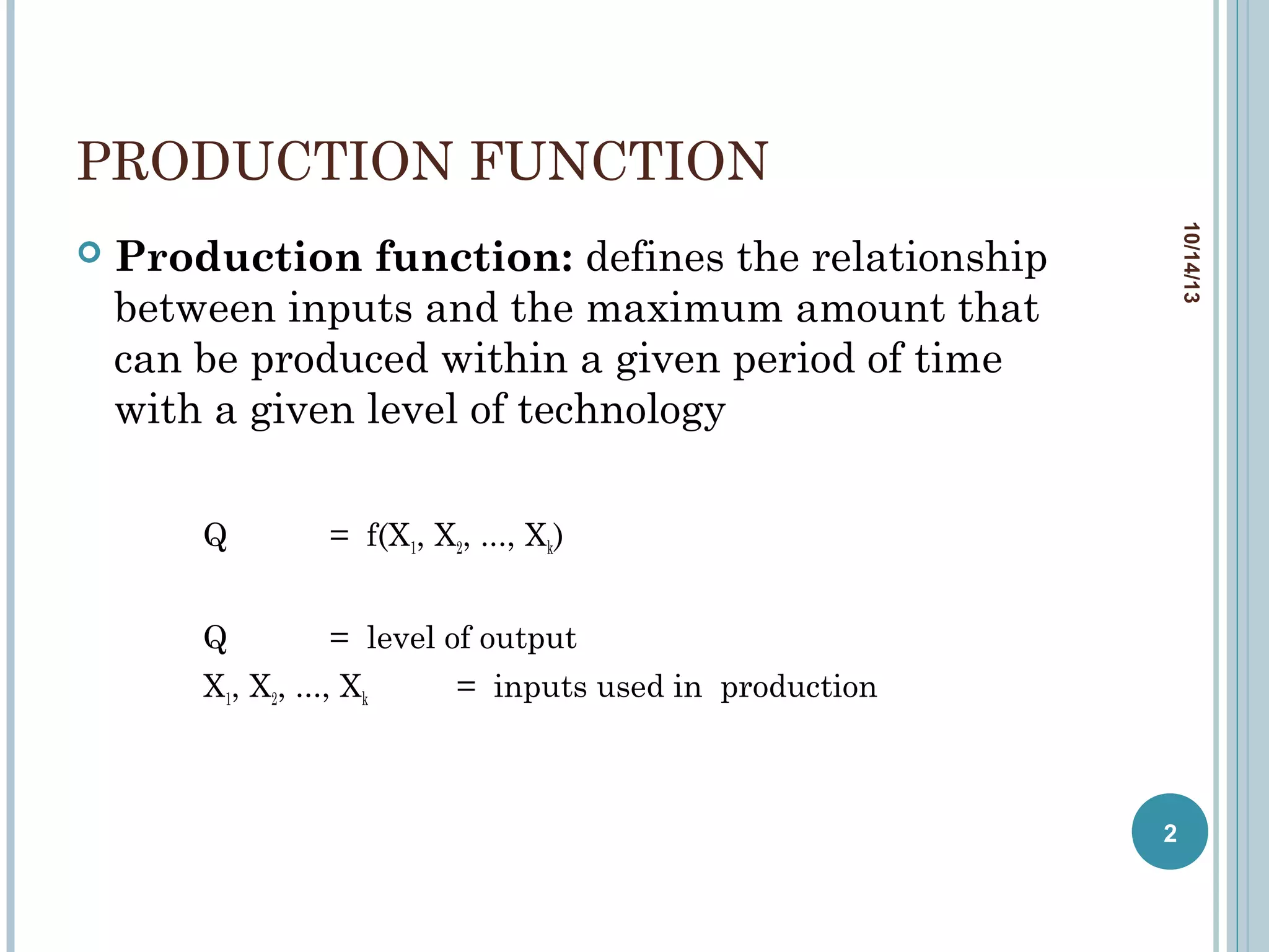 1. A production function defines the relationship between inputs used in production and the maximum output that can be produced. It takes the form Q = f(X1, X2, ..., Xk), where Q is output and X1, X2, ..., Xk are inputs.