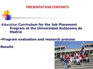 The document describes an education for job placement program at Universidad Autónoma de Madrid for people with intellectual disabilities. [1] The program includes a 2-year study plan with courses to develop skills like communication, relationships, math, and technology as well as a practicum experience. [2] It evaluates the program's effectiveness through questionnaires, interviews and other methods and finds high satisfaction among students, teachers and partners about the students' development and inclusion on campus and in the workforce. [3]