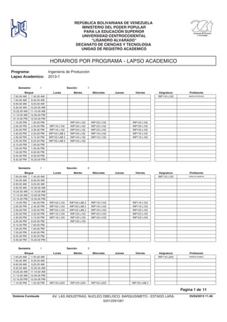 This document contains class schedules for several sections of the Production Engineering program at a university in Venezuela for the 2013-1 academic period. It provides the course codes, names, times, days and room assignments for each class block for semesters 1 and 2 across 6 sections of the program. The schedules are broken down by section and semester with the corresponding class details.