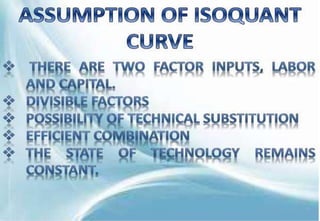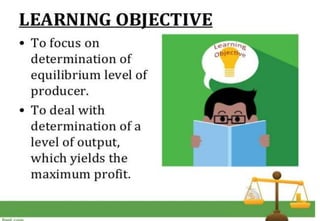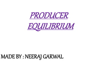 A producer seeks to maximize profits by producing at the level of output where marginal revenue equals marginal cost. This occurs at the producer's equilibrium. There are three main approaches to determining the producer's equilibrium: (1) where the isoquant is tangent to the isocost line, (2) where marginal revenue equals marginal cost, and (3) where the difference between total revenue and total cost is maximized. The equilibrium level of output is where profits are maximized and will fall if output increases beyond this level. Producer equilibrium can occur when price is constant, as in perfect competition, or when price decreases with increased output, as in imperfect competition.