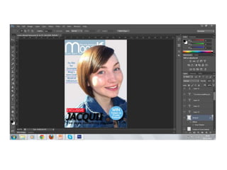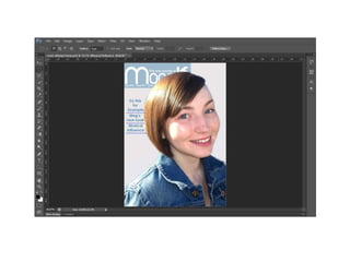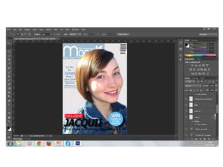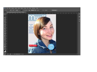 1) The document describes the process of creating a magazine front cover for a coursework assignment.