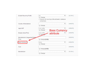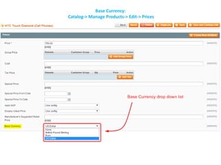The document outlines the steps for configuring price base currency within a system's catalog. It includes managing products and editing price promotions using catalog price rules. The focus is on navigating the catalog settings for effective product pricing management.
