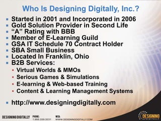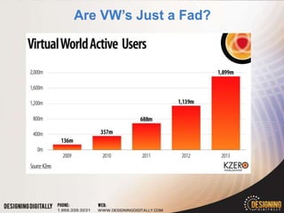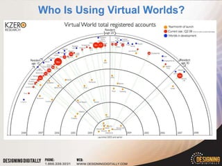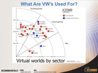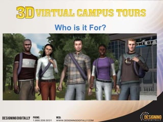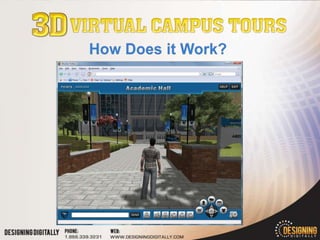 The document discusses virtual world options for educational institutions. It provides information on commercial virtual worlds like Second Life, open source options like OpenSim, and browser-based virtual worlds. It also introduces 3D Virtual Campus Tours, a product designed by Designing Digitally specifically for higher education recruitment. Key features highlighted are that it is fully browser-based, specialized for enrollment, and can replicate a campus in high quality graphics. Potential downfalls discussed are higher pricing and lack of editing tools compared to other virtual worlds.