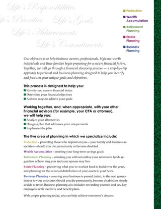 The document outlines strategies for financial planning, focusing on life insurance, disability insurance, wealth accumulation, retirement planning, estate planning, and business planning to secure one's financial future. It emphasizes the importance of protecting assets and loved ones from unforeseen circumstances while promoting a structured approach to identify and achieve individual financial goals. The goal is to assist business owners and families in creating and implementing personalized plans that address their unique needs and ensure long-term financial stability.