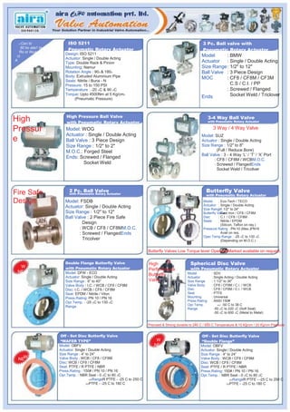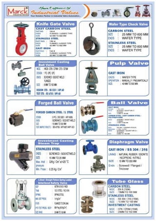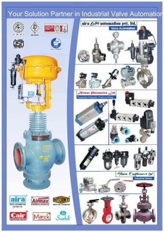 This document provides information on various types of industrial valves and actuators available from a solution partner in industrial valve automation. It lists specifications for over 30 different products including ball valves, butterfly valves, control valves, solenoid valves, and accessories like positioners and filters. The valves and actuators come in a range of sizes and are suitable for applications involving air, water, oil, gas, and steam.