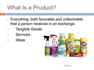 The document explains the concept of a product as everything a person receives in an exchange, including tangible goods, services, and ideas. It emphasizes that organizations should focus on continuous improvements to meet consumer preferences, showcasing Apple as an example of successful product evolution. The presentation addresses various types of marketed products, including physical goods, services, and experiences.