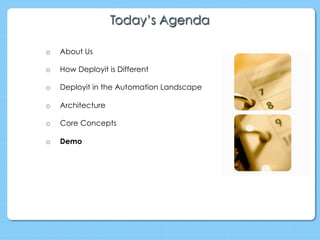 The document discusses Deployit, an application release automation platform from XebiaLabs that aims to optimize the application deployment process by reducing costs, accelerating time to market, and bridging the gap between development and operations. Deployit utilizes deployment packages, environments, and deployments to automate application releases in a lightweight and scalable way that supports both public and private clouds.