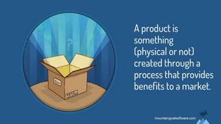 The document outlines the essential components of product design, including problem formation, product strategies, value, and planning. It emphasizes a structured approach through a seven-step design process and highlights the significance of understanding user needs. Additionally, it discusses product life cycles and value metrics, providing a comprehensive guide for developing effective products.