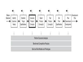 The document outlines a five-step method for concept generation in product design, starting with problem clarification and leading through external and internal search for solutions. It emphasizes the importance of generating a wide array of product concepts and systematically exploring them to ensure thorough consideration of alternatives. Effective concept generation is critical to satisfying customer needs and enhancing the likelihood of commercial success.