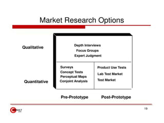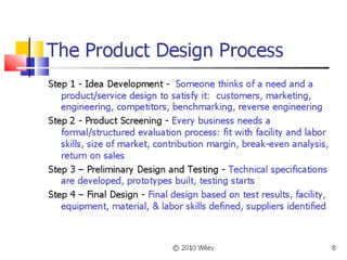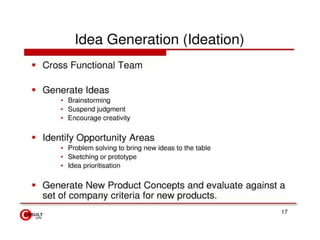 The document discusses best practices for product design and development. It outlines key aspects of the process including identifying customer needs, establishing target specifications, concept generation, concept selection, concept testing, and setting final specifications. It also describes an evaluation framework that allows companies to compare their performance to industry benchmarks and best practices. The framework is used to develop an improvement plan by assessing a company's current situation, identifying gaps compared to best practices, and determining priorities based on business strategy and best practices.