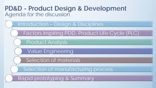This document discusses product design and development. It covers factors that inspire product design such as identifying gaps in demand, underutilized resources, and new product ideas. It also discusses marketing factors to consider like market potential and competition. Additionally, it outlines the stages of new product development including idea generation, concept development, market strategy development, feasibility studies, product design, testing, and commercialization. Finally, it discusses the product life cycle and how investment depends on what stage the product is in such as introduction, growth, maturity, or decline.