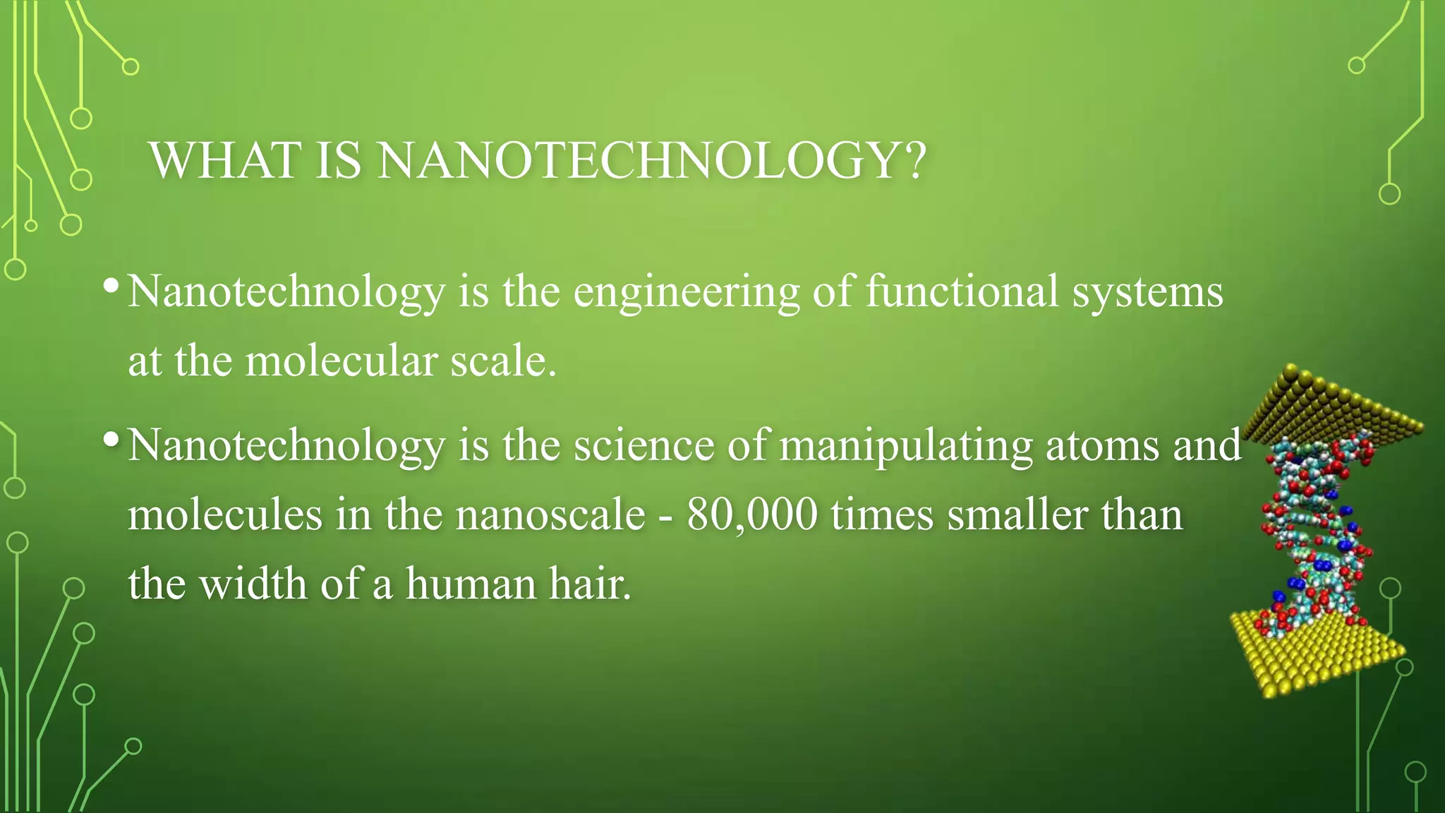 Nanotechnology is the engineering of functional systems at the molecular scale, manipulating atoms and molecules that are 80,000 times smaller than the width of a human hair. It has applications in everyday materials and processes, electronics, sustainable energy, environmental remediation, medicine, health, transportation, and cosmetics. In cosmetics, nanotechnology is used in mineral UV filters, nanocapsules, nanosilver and nanogold for antibacterial properties, and buckyballs for free radical scavenging in expensive face creams. Nanoparticles can also detect and help clean environmental contaminants and purify water.
