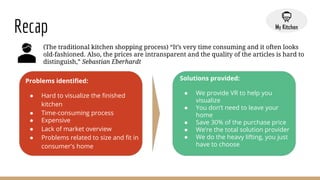 The document outlines a business model for a kitchen design service that utilizes virtual reality (VR) to address common consumer pain points such as high costs and difficulty visualizing kitchen renovations. It involves a four-step process from consultation to installation, targeting a demographic of digitally-savvy consumers aged 25-55. The service distinguishes itself by providing in-home consultations and saving customers up to 30% compared to traditional retail options.