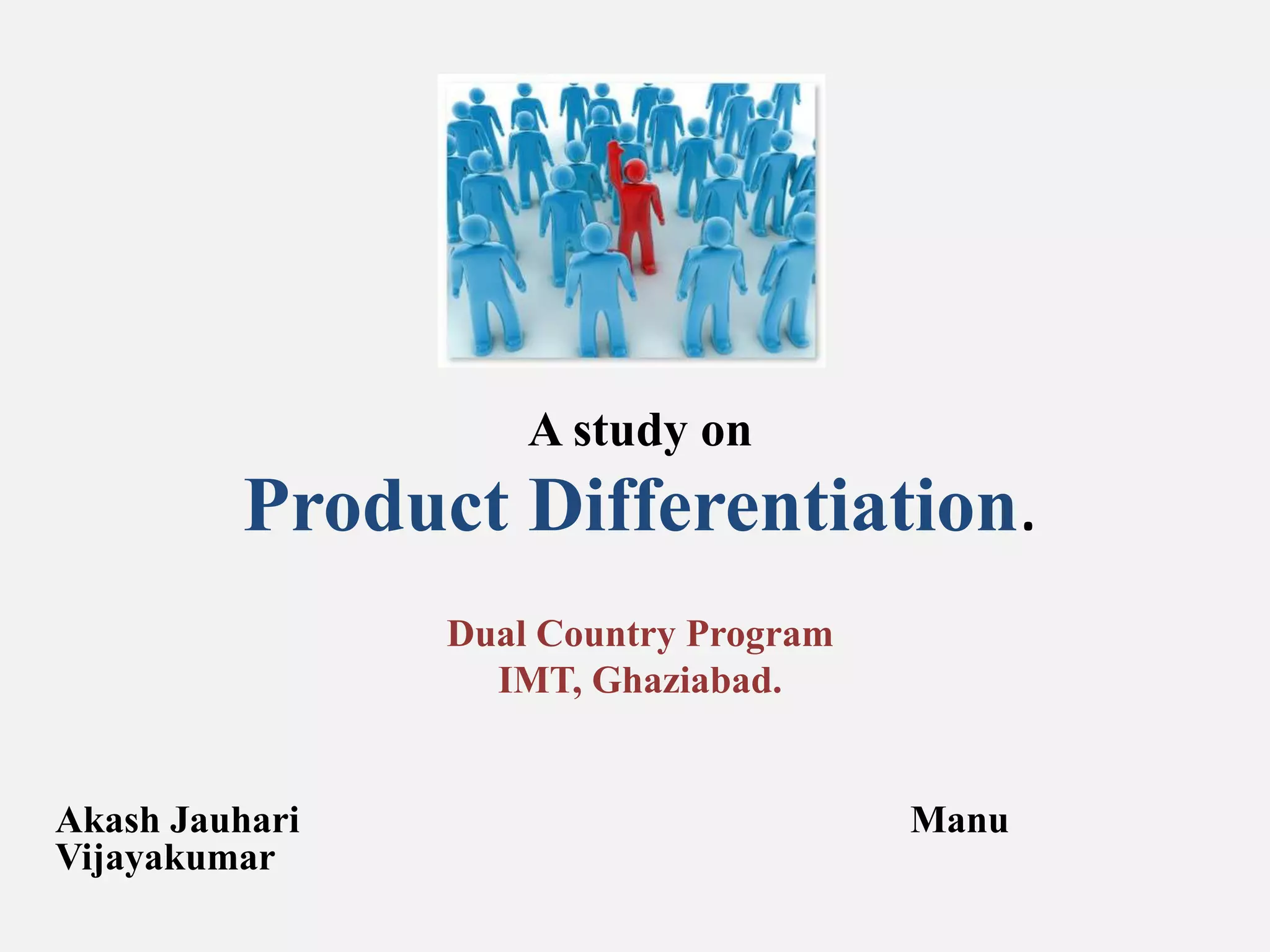 The document discusses various strategies companies use for product differentiation, including differentiation by form, features, customization, durability, reliability, quality, style, price, and service. It provides examples of companies that use each strategy, such as NDTV Good Times differentiating by targeting young urban Indians, Apple differentiating iPhones through customization, and Taj Hotels differentiating through outstanding hospitality and service. In conclusion, it states that differentiation helps companies dominate market segments and that market leaders use these strategies.