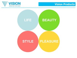 This document appears to be a product catalog for a company called Vision that produces various health and beauty products. It lists different product lines such as Classic Hit, Direct Hit, Restoration series, and Anti-stress series. It also mentions that Vision operates under the World Health Organization and produces tea and cosmetic products that meet high quality standards.