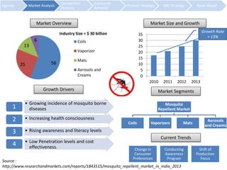 The document outlines a marketing project for a new mosquito repellent product called "K!LL". It analyzes the market size and growth trends, key competitors and their market shares. It identifies the target consumer segments and their characteristics. The marketing mix of product, price, place and promotion strategies are proposed, including advertising, sales promotions and events. The integrated marketing communications strategy aims to communicate the product's value of killing 98.5% mosquitoes within 9 minutes to care for consumers' smiles. The large untapped rural market is identified as a future target.