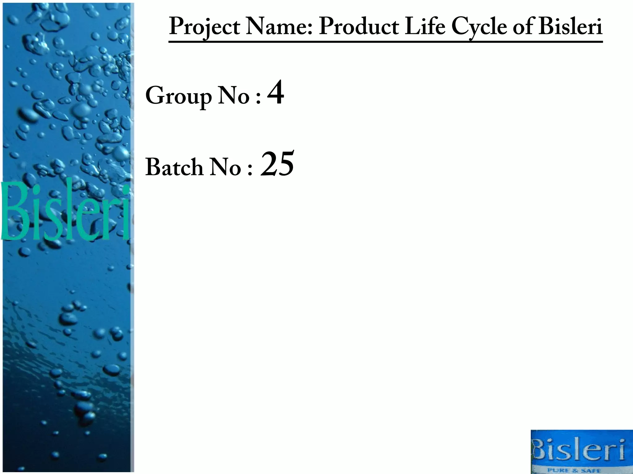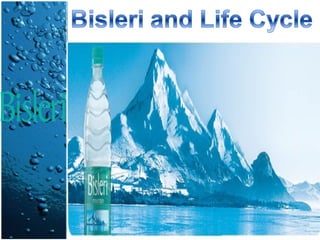 The document summarizes the product life cycle of Bisleri bottled water in India. It describes the four stages of the product life cycle: introduction, growth, maturity, and decline. It then provides details about Bisleri's introduction in 1965, its growth throughout the 1980s and 1990s as it expanded operations and saw exponential growth. The summary discusses Bisleri's marketing strategies including market segmentation targeting different package sizes to different customer groups, and competitors in the bottled water market like Kinley and Aquafina.