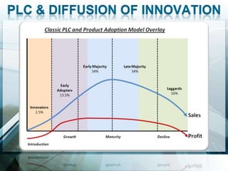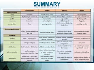 The document discusses the product life cycle (PLC), highlighting its limited duration and distinct stages, including introduction, growth, maturity, and decline, each requiring tailored marketing strategies. It emphasizes the challenges and opportunities faced at each stage, the impact of competition, customer behavior, and innovations on sales, and strategies to extend product life. Additionally, it notes the variability in PLC patterns and the potential pitfalls of rigidly adhering to PLC concepts in marketing decisions.