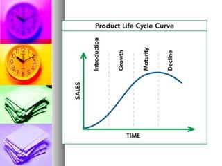 The document discusses the product life cycle, which describes the stages a product goes through from introduction to decline. It outlines the four stages: market pioneering, growth, maturity, and decline. For each stage, it provides features and implications for marketing strategy, such as pricing, competition levels, and costs. The product life cycle concept helps formulate strategies to prolong the profitable phase and determine optimal times for product investment or exit. However, limitations include difficulty measuring the product's stage and different products having varying life cycle shapes.