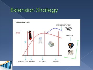 The document discusses the product life cycle and strategies for extending a product's life cycle. It begins by asking students to name products from Virgin and gives them 3 minutes to do so. It then provides information on the stages of the product life cycle: development, introduction, growth, maturity, saturation, decline, and withdrawal. The document notes that extension strategies can be used during maturity or early decline to prolong a product's life cycle, such as redesigning, adding new features, or changing packaging/advertising to appeal to new market segments. Students are assigned tasks to illustrate the product life cycle, identify example products in each stage, and determine extension strategies as a group for a selected product.