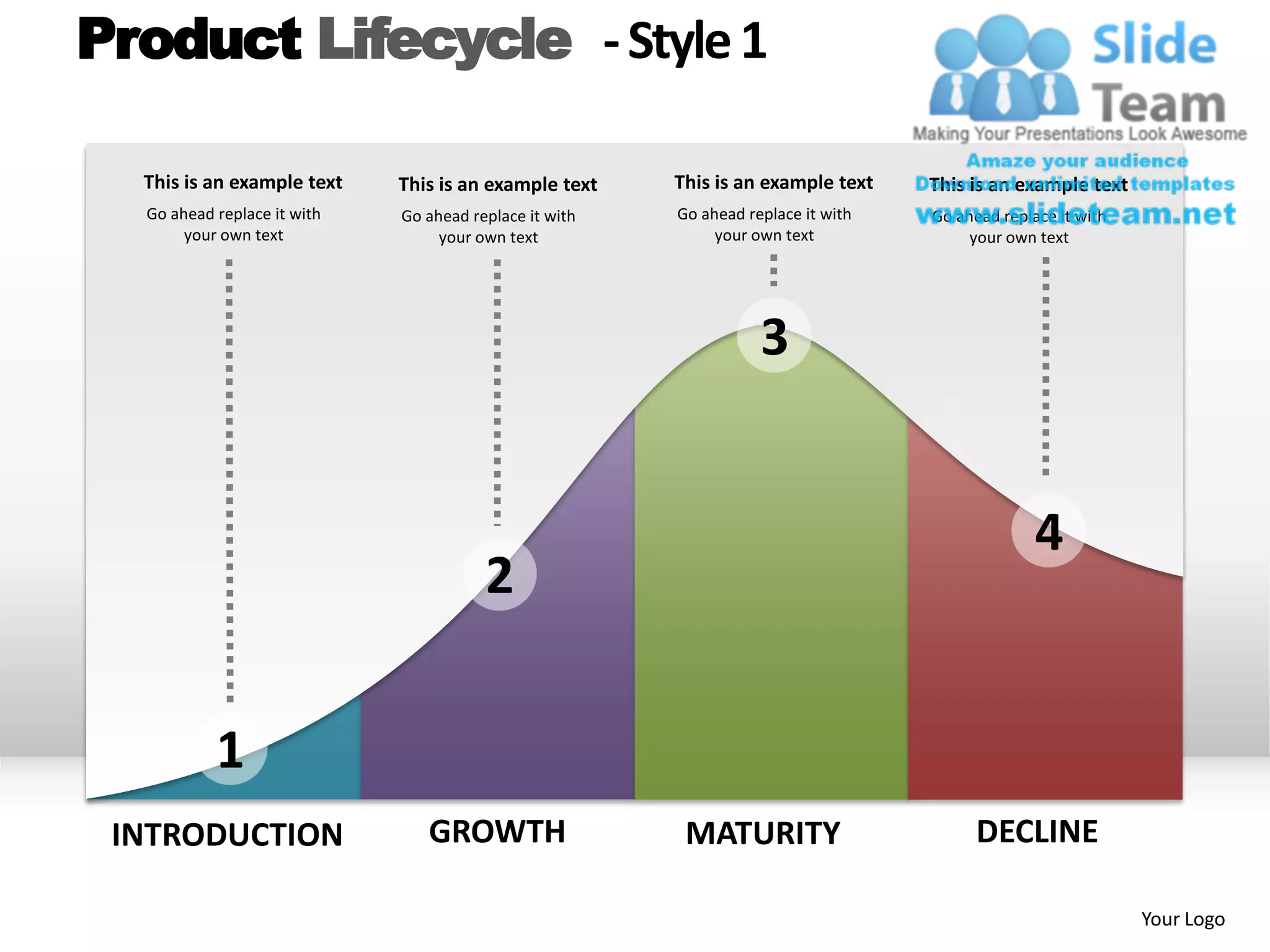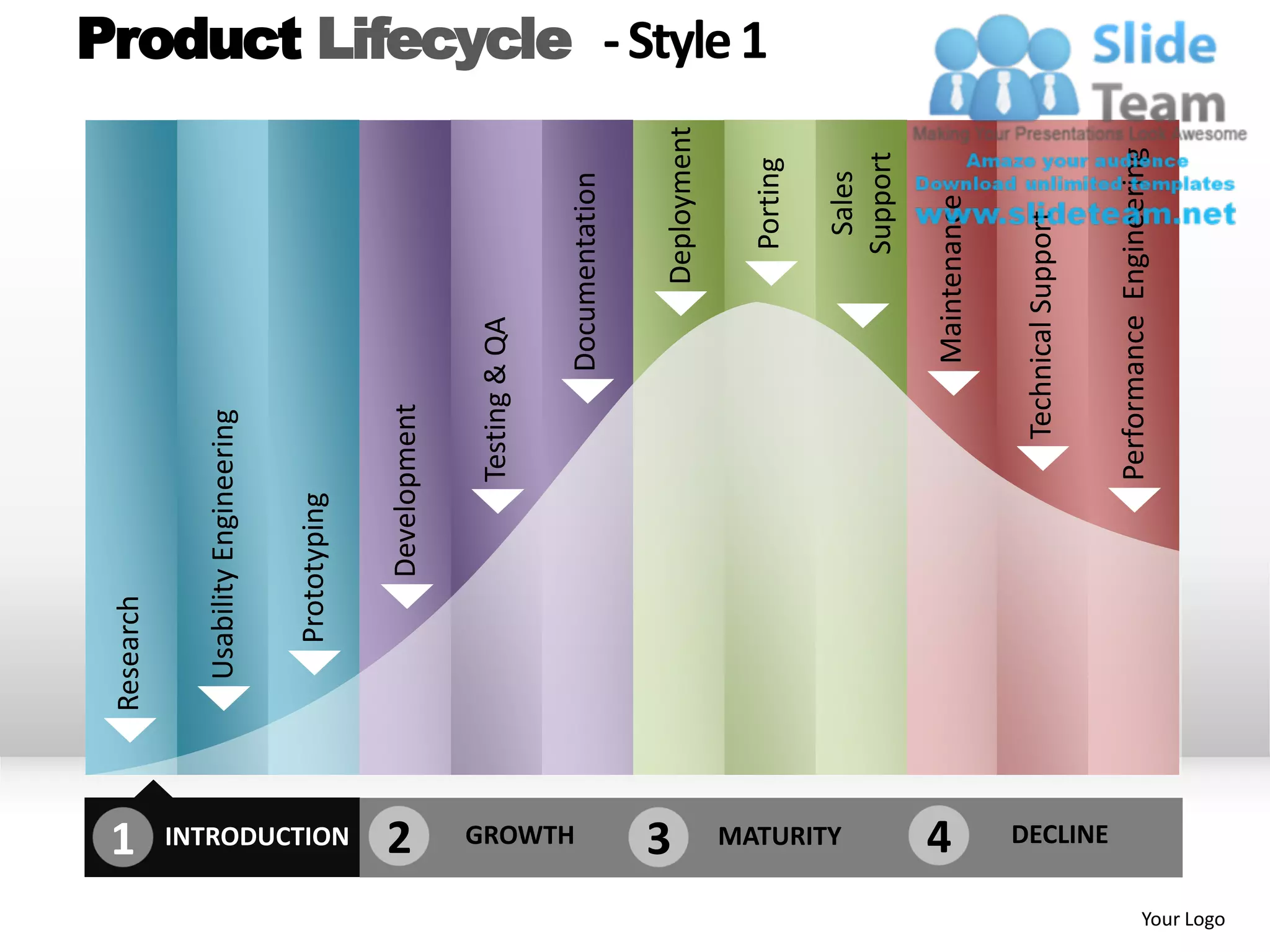 The document describes the typical stages in a product lifecycle model: introduction, growth, maturity, and decline. It includes examples of activities that occur at each stage, such as research and development during introduction, sales and support during growth, maintenance during maturity, and technical support during decline. The document also provides examples of how the product lifecycle model can be depicted visually in a graph or diagram.