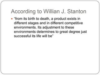 The product life cycle has four main stages: introduction, growth, maturity, and decline. During the introduction stage, the objective is to attract early adopters with strategies like rapid or slow skimming. In the growth stage, competition increases and strategies focus on expanding distribution and product lines. The maturity stage sees sales and profits stabilize as the market becomes saturated. In decline, sales decrease due to factors like new technologies, and strategies aim to cut costs or terminate the product.