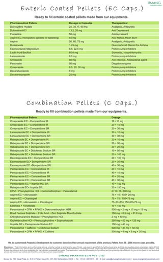 This document provides information on various pharmaceutical products that can be produced as sustained release pellets, enteric coated pellets, combination pellets, and mouth dissolving films. It lists over 80 active pharmaceutical ingredients that are available as sustained release pellets in dosages ranging from 1 mg to 90 mg. It also provides details on enteric coated pellets, combination pellets containing different drug formulations, and over 50 products that can be produced as rapid dissolving oral films. The manufacturer produces customized projects and pellets from 50-2500 microns based on annual customer requirements.