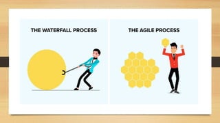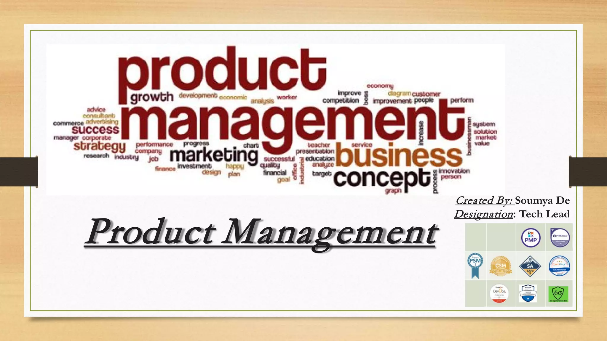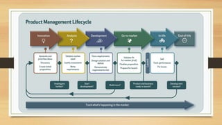 Product management involves developing a product strategy, deciding what to build, and marketing/selling the product. It focuses on understanding customer needs and problems. Key responsibilities include formulating a vision, specifying features, managing projects, and improving execution. An agile methodology is well-suited for fast-moving startups as it allows for frequent delivery of working software and ability to adapt quickly based on customer feedback.