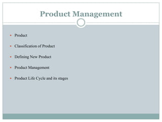 This document summarizes key concepts related to product management. It defines a product, classifies products as goods, services, or ideas. It describes defining new products based on business needs and constraints. Product management is defined as dealing with planning, forecasting, and marketing a product throughout its lifecycle stages of introduction, growth, maturity, and decline. The roles of product management include analyzing markets, defining product features, driving new products, and activities from strategic to tactical levels.