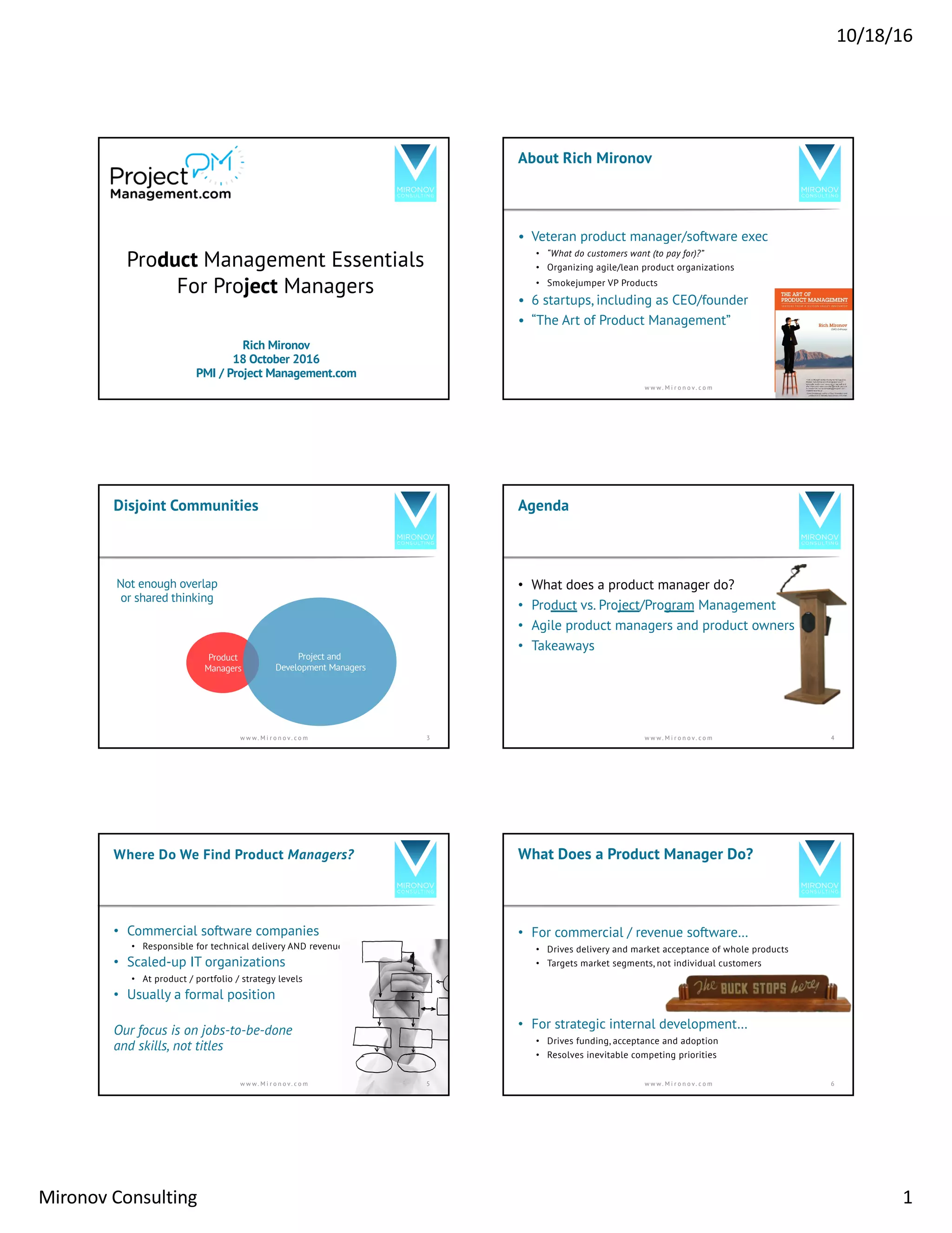 This document discusses the roles of product managers and their relationship to project managers. It begins by noting that product managers and project managers often operate in disjoint communities without shared understanding. It then defines the responsibilities of product managers as driving market acceptance and success of products, while addressing competing priorities. Product managers must make decisions around what to build despite uncertainty and limited resources. The document contrasts the outward-facing concerns of product managers with the inward-facing resource allocation focus of project managers. It also discusses how agile product owners can fail to fully address market needs. The takeaways are that both roles struggle with different challenges and that we need collaboration to ship great products.