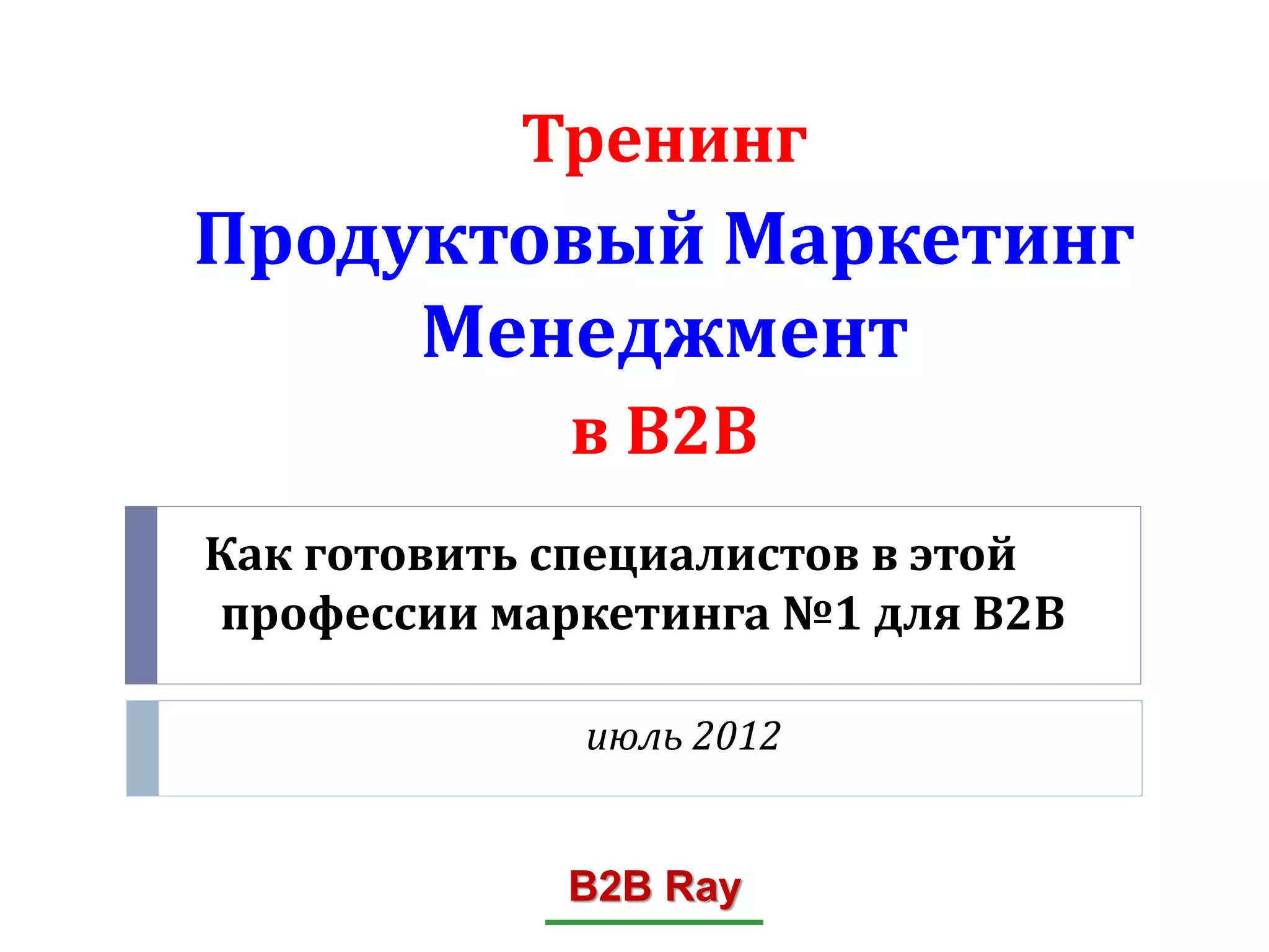 Документ описывает тренинг по продуктовым маркетинг-менеджменту в секторе В2В, освещая цели, методики и программу обучения. Он подчеркивает важность эффективного управления продуктами и недостаток квалифицированных специалистов в Украине, а также проблемы, связанные с коммодизацией и ценовыми войнами на рынке. Результаты тренинга включают финальный отчет и рекомендации по развитию продуктового менеджмента в организациях.
