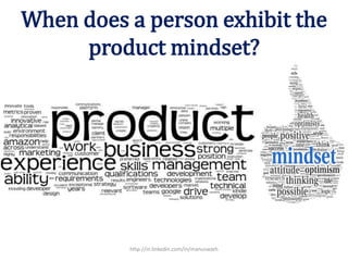 A 'product mindset' prioritizes intrinsic motivation and product acceptance as key rewards, unlike a 'service mindset.' Individuals with a product mindset embrace feedback, are willing to explore innovative features with inherent risks, and focus on customer value and satisfaction. Additionally, they are committed to their teams, take ownership of problems, and value domain expertise in their roles.