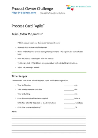 This document describes two different processes - Waterfall and Agile - for a product owner challenge. Under the Waterfall process, there are 4 phases: 1) upfront planning, 2) defining requirements, 3) building the product, and 4) testing the product. The Agile process involves the product owner explaining the product vision through user stories, estimating story sizes, defining sprints to finish stories, building and testing the product, and adjusting planning as needed. A time-keeper will record metrics like time spent on each phase and number of defects for each process.