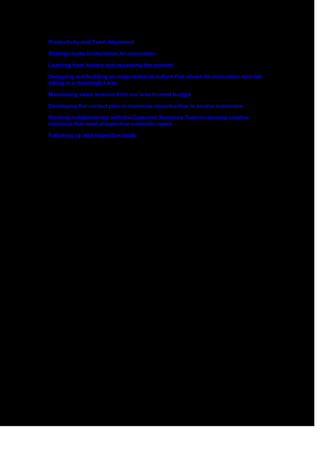 The document discusses various topics related to art, architecture, education, and business including application development, budgeting, business processes, client services, data science, reporting, adding new services, performing technical upgrades, productivity, team alignment, strategy, innovation, history, culture, sales revenue, budgets, contact plans, collaboration, customer solutions, and following up on leads. It touches on a wide range of subjects across different domains.