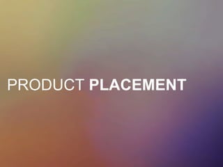 Product placement is a form of advertising where brands pay to have their products featured in movies, TV shows, and other media. It allows brands to raise awareness subtly without traditional commercial interruptions. There are two main types - prominent placements with logos clearly visible and subtle background placements. Success is measured by increased sales following a movie's release. Famous examples include Reese's Pieces in E.T. and BMW cars in James Bond films. Marketers are increasingly integrating brands directly into scripts. Movies also rely more on brand funding due to higher production budgets.