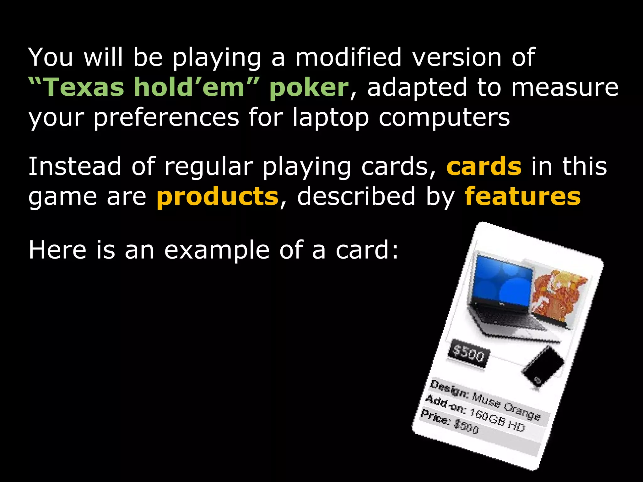 You will be playing a modified version of Texas hold'em poker where cards represent laptop computers described by features like color, accessory, and price instead of regular playing cards. The goal is to build the strongest poker hand by selecting 5 cards and their features. Hands are ranked from weakest to strongest as one pair, two pairs, three of a kind, full house, and four of a kind. By winning rounds, you can win the laptop represented in your winning hand plus additional cash up to $600.