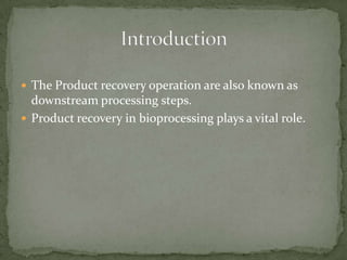 This document summarizes downstream processing steps in bioprocessing. It discusses various unit operations used for product recovery including cell removal, dewatering, protein purification through adsorption chromatography or immobilization, and protein packaging through sterilization. Methods for solid separation like filtration, sedimentation, centrifugation and foam separation are described. The document also provides details on precipitation, filtration processes, and different types of filters used.