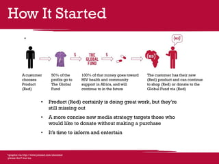 The document proposes an "If(Then)" marketing campaign using social media, videos, and mobile payments to directly target potential donors and inform them about how to contribute to HIV/AIDS relief efforts through Product (Red) without needing to make a purchase, with the goal of increasing donations and helping Product (Red) "finish saving the world". Metrics like social media engagement, video views, ad clicks, and mobile transactions would track the campaign's success in expanding Product (Red)'s donor base.