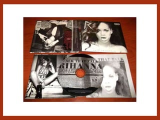 The first section examines digipaks for albums by Rihanna and Katy Perry. Both feature provocative images of the artists that may not be suitable for younger audiences, despite Perry appealing to wider demographics. Color schemes and imagery carry symbolic meanings that relate to the music.
